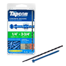 The Tapcon 24340 is a professional-grade 1/4 in. x 3-3/4 in. hex-head concrete screw designed for high-strength fastening into concrete, brick, and hollow block. Featuring the industry-leading Climaseal blue coating, these anchors offer exceptional corrosion resistance and long-lasting performance in demanding environments. The advanced thread design reduces installation torque by up to 30%, while integrated underhead ribs minimize the risk of head snaps during high-torque applications. This 75-count pack is ideal for securing sill plates, electrical equipment, and furring strips, and typically includes a carbide-tipped drill bit for a complete installation solution.