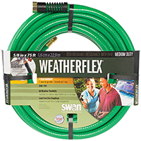 The Swan WeatherFLEX® 5/8-inch x 75-foot garden hose is a medium-duty, all-weather solution designed for consistent performance in both hot and cold temperatures. Featuring a high-visibility mint green jacket, this hose is constructed with a reinforced multi-ply design and an abrasion-resistant outer layer for long-lasting durability. It includes patented Hose Armour® at the female coupling to prevent kinking at the water source and is equipped with crush-resistant aircraft-grade aluminum couplings. With a 300+ PSI burst strength, it is an ideal choice for professional landscaping, general maintenance, and everyday watering tasks.