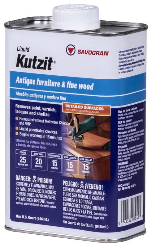 For refinishing fine furniture and antiques, Kutzit® is the professional refinishers choice. It is excellent for horizontal surfaces and its liquid formula cuts fast and penetrates carved detail. Kutzit® is gentle on the patina of fine wood and veneers and will not raise wood grain. Surfaces can be cleaned with a scraper and washed with a cloth and paint thinner. Kutzit® is flammable and is recommended for use outdoors.